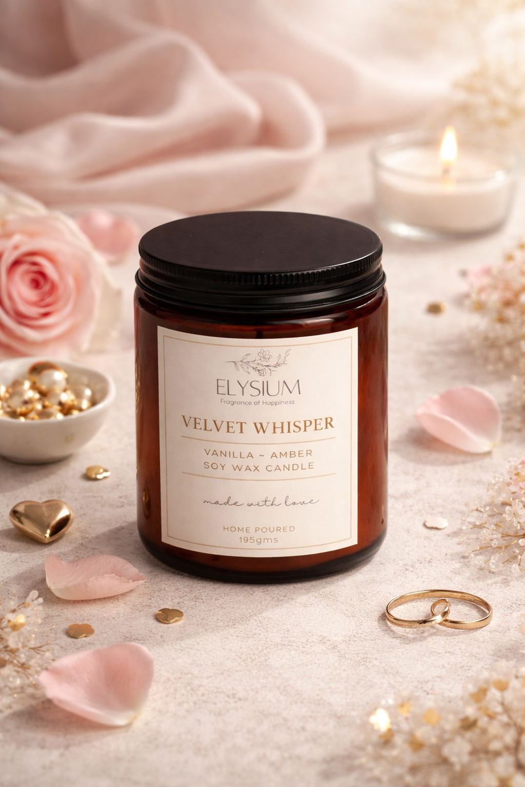 Velvet Whisper is an ode to romance, warmth, and timeless love. This luxurious soy wax candle from ELYSIUM envelops your space in an irresistible blend of Vanilla & Amber, creating an atmosphere that feels intimate, comforting, and deeply alluring.